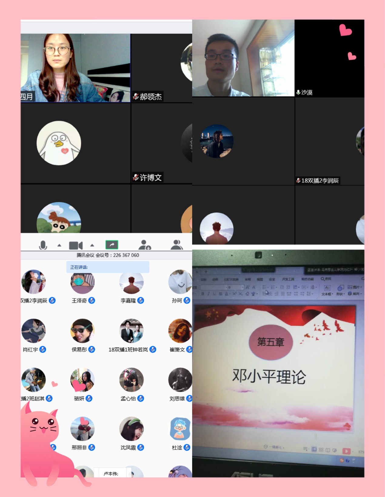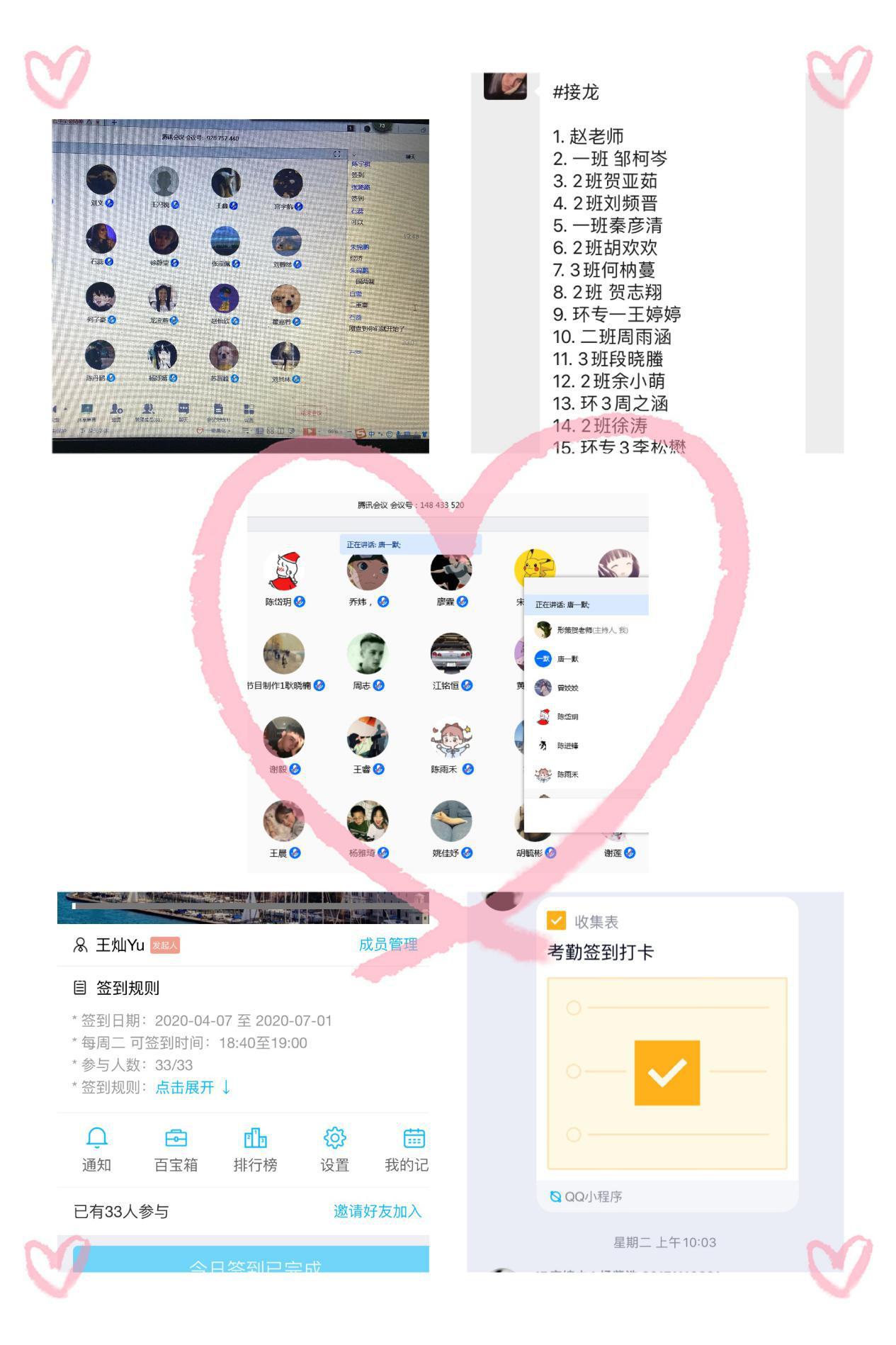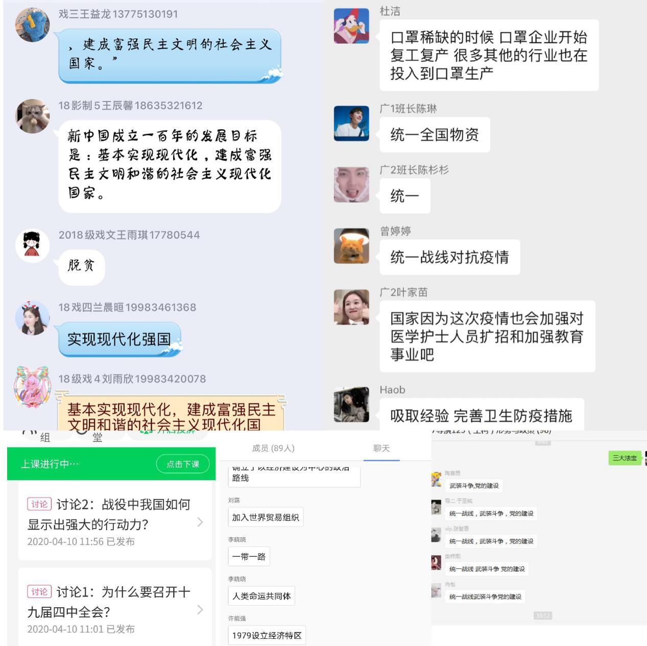 5.学生能够在安排的时间内完成学习任务,能够按时进入腾讯会议,学生与老师之间的互动良好,教学秩序正常。个别学生因为网络信号受影响,在腾讯会议听课过程中因停顿延迟现象,但是老师会在课后进行补充。