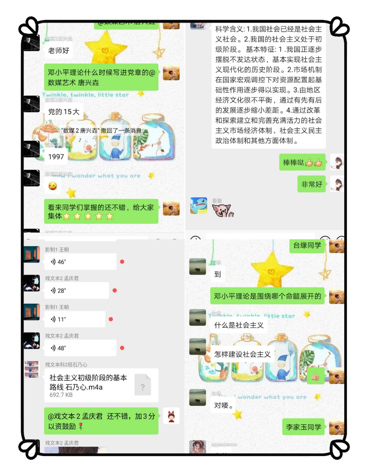 总之,在本周的教学过程中,学生整体表现良好,能够按时出勤并完成课堂任务。课堂中基本都认真听课,答题正确率高,部分学生做了详细的上课笔记;一些学生比较活泼,在课堂中遇到问题能够积极发问,且能在老师引导下积极完成线上线下学习任务;还有部分学生善于思考,答题思路清晰。经过前六周的学习,同学们对本门课程培养了一定的兴趣、积累了一基础知识,参与课堂互动的积极性有了较大提升。在以后的教学过程中希望老师们能够继续鼓励学生,帮助他们培养学习兴趣,认真完成学习任务,确保都能够在线上教学期间学所收获。
