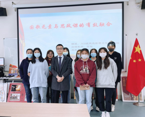 2021年4月19日下午14:30—16:00,马克思主义学院贺驰老师组织2020级戏剧影视文学3班的10位同学在A1-218实训室开展以“国歌元素与思政课的有效融合”为主题的实践活动。