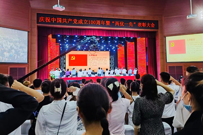 首先、大会在庄严的国歌声中拉开序幕,全体师生起立,奏唱国歌。紧接着,党委副书记刘黎同志带领全体参会党员面向党旗庄严宣誓,重温入党誓词,表达了忠于党、守初心、践使命的坚定决心。党委书记马洪奎同志在报告中回顾了中国共产党建党100周年的历史,号召大家要珍惜今天来之不易的幸福生活,并围绕学校发展的新形势以及高质量发展的新要求发表了讲话。
