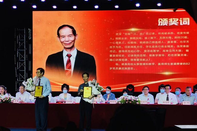 最后,由张书玉同志向康庆良同志、马洪奎同志颁发了特殊贡献奖与杰出贡献奖。在两位老党员发言时,现场掌声不断,不少师生热泪盈眶,大会在朝气蓬勃的《在灿烂阳光下》《没有共产党就没有新中国》的歌声中圆满落下帷幕。