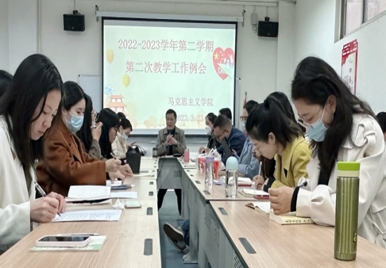 2023年3月23日上午,四川传媒学院马克思主义学院于东区第一教学楼218会议室召开2022-2023学年第二学期第二次教学工作例会。会议由赵万江院长主持,学院全体教师参加。