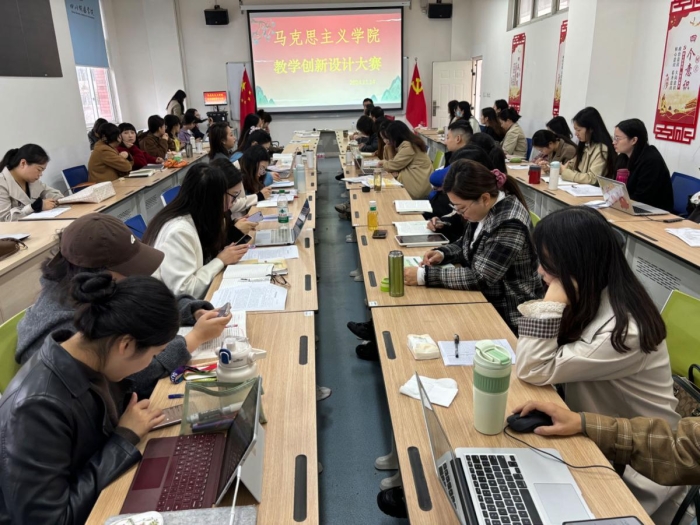 2024年11月14日上午九时许,在四川传媒学院东校区第一教学楼的218会议室,举行了“马克思主义学院教学创新设计大赛”的比赛,最终,马雨蒙老师团队脱颖而出,将代表马克思主义学院参加学校的教学创新设计大赛。随后,马雨蒙老师代表团队在全院进行了设计展示,现场氛围热烈,全院教师认真观摩。